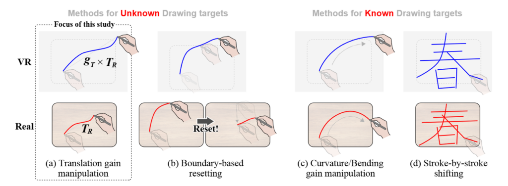 Drawing, writing, and painting on 2D surfaces in VR offers arbitrary interaction with virtual canvases of unlimited size. We propose Redirected Drawing, a novel methodology that applies visual manipulation to the user’s drawing movement in VR to expand the perceived surface size required for the drawing experience. To this end, this study specifically explores translation gain manipulation, where the displacement of a drawing stroke in reality is simply multiplied by a gain to represent it in VR. Our results show that pen-based drawing on a physical surface allows for a gain of up to 1.16 without being noticed by the user, which is more suited to expanding a virtual canvas size than finger-based drawing on a physical surface or in mid-air.