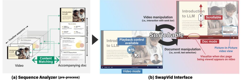 - Taichi Murakami, Kazuyuki Fujita, Kotaro Hara, Kazuki Takashima, Yoshifumi Kitamura. SwapVid: Integrating Video Viewing and Document Exploration with Direct Manipulation, Proc. of the 2024 CHI Conference on Human Factors in Computing Systems (CHI ’24), Article No. 1035, pp. 1-13, May. 2024.