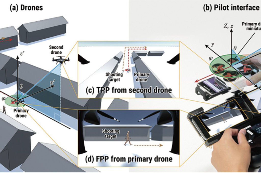 We propose Third-Person Piloting, a novel drone manipulation interface that increases situational awareness using an interactive third-person perspective from a second, spatially coupled drone. The pilot uses a controller with a manipulatable miniature drone. Our algorithm understands the relationship between the pilot’s eye position and the miniature drone and ensures that the same spatial relationship is maintained between the two real drones in the sky. This allows the pilot to obtain various third-person perspectives by changing the orientation of the miniature drone while maintaining standard primary drone control using the conventional controller.